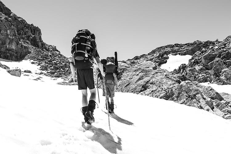 Knowing that we would have to change our plan dramatically due to the high waters of Peak Lake, we woke up early to a beautiful sunrise, and ate breakfast as we watched the sun slowly creep down the sides of the mountains that surrounded us. As our modified route, we decided to summit the Cube Rock Pass, that would lead us down in to the valley alongside the glaciers that we had originally hoped to traverse. Climbing the Cube Rock Pass, was easier said than done. Without question, the steep wall of rocks and snow was the riskiest climb that we faced the entire trip, and the wall took us over 3 hours to summit.