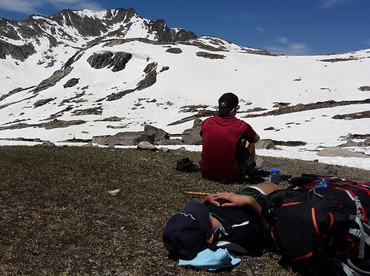 After some delicious freeze-dried breakfast skillet and an unsuccessful attempt to dry our socks and boots, we got back on the trail and began our long ascent up to Peak Lake. Starting at 8,200 feet of altitude, our goal was to make our way up to over 10,700 feet in elevation finishing at Peak Lake which sat at 10,515 feet. We began with a slow incline to Vista Pass, where we started our serious ascent. With our first snow at 9,400 feet, we began to see more and more snow as we went.