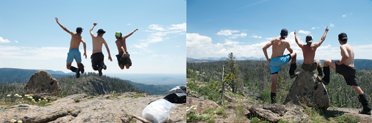 With most of our serious mileage behind us, we started our day with some scrambled eggs, hopped into our unusually dry socks and boots, and trekked south towards Blueberry Lake. Early into our hike, we summited one of the peaks on our list, and realized that we hadnât taken any pictures of our âtailgrabs atop mountains,â so we decided that it was due time for a photo shoot. We might have also taken our shirts off…
