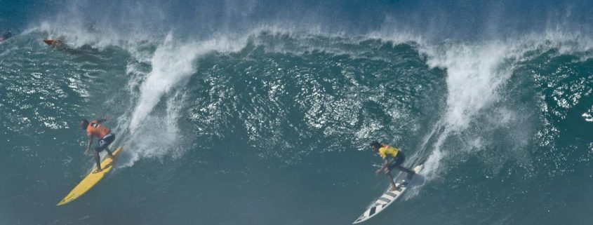 Sunny Garcia, left and Greg Long, right, drop into one of their heat’s last waves at the Quiksilver In Memory of Eddie Aikau big wave surf contest on the North Shore at Waimea Bay, Hawaii Tuesday.